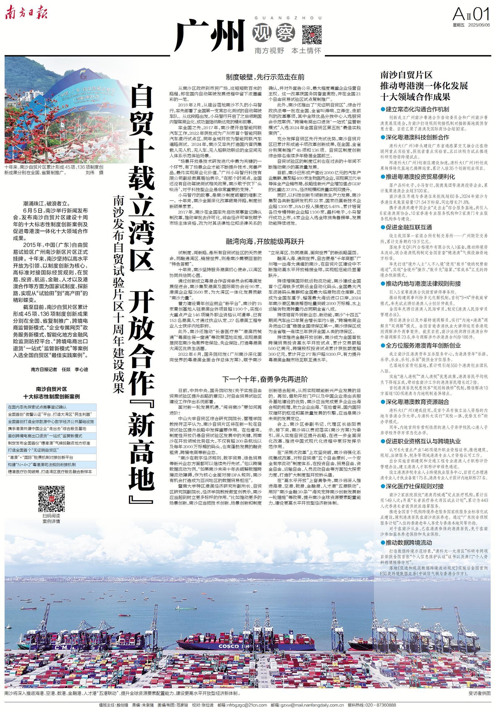 6月5日,南沙发布南沙自贸片区建设十周年的十大标志性制度创新案例及促进粤港澳一体化十大领域合作成果。